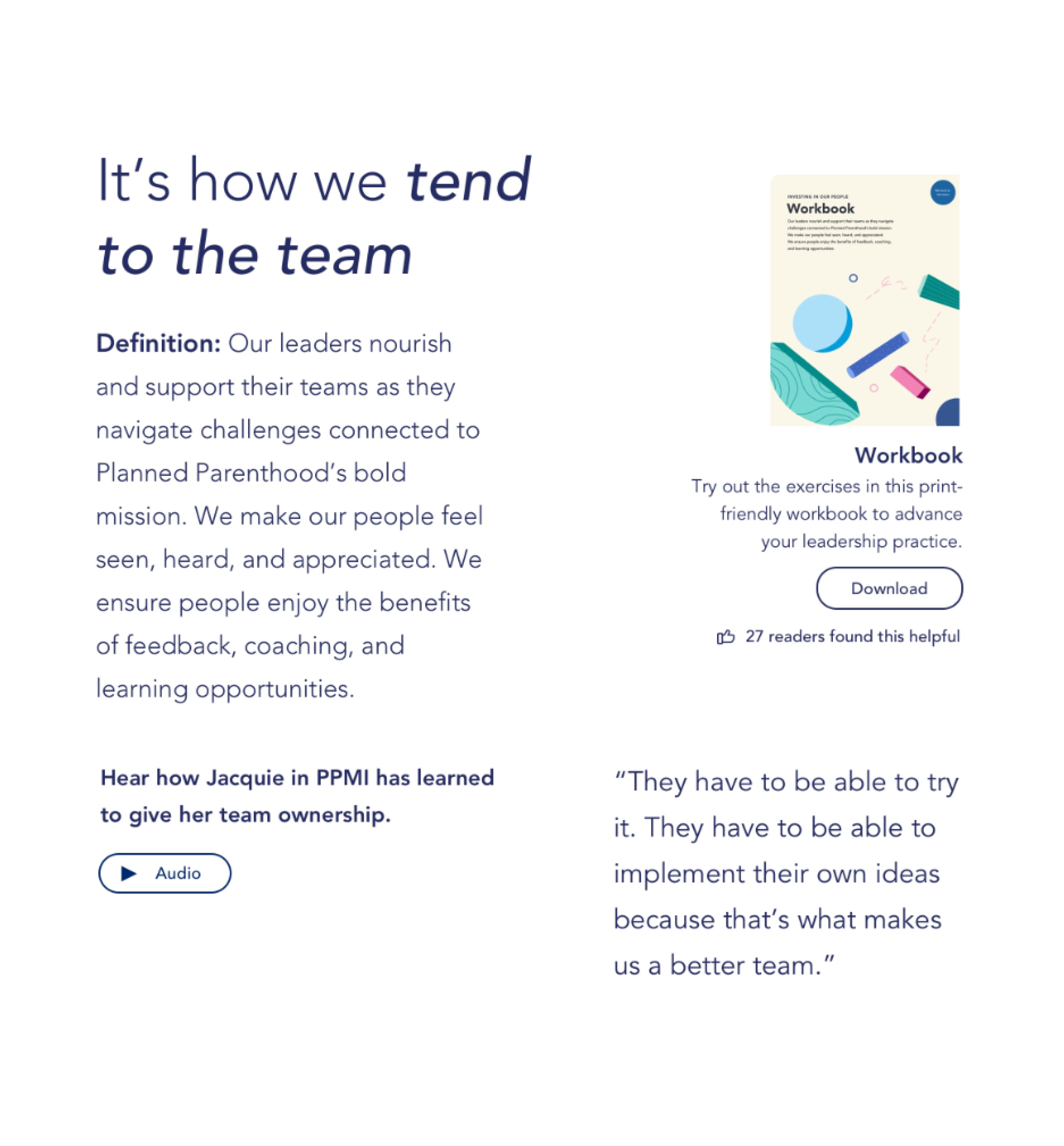 As the project lead and art director, I collaborated with a small, multidisciplinary team to develop leadership competencies for Planned Parenthood. I art directed the illustrations, established the brand language, and led the visual design, including color, typography, and website design.